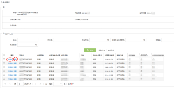 (3)查看公示人员列表,并可通过点击“申报表”或“查看按钮”查看申报人员详细信息。