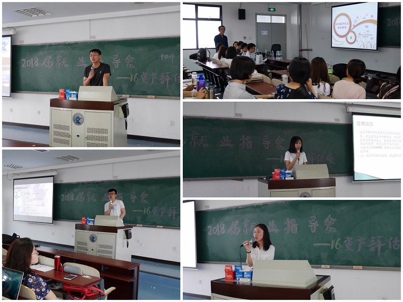 为帮助同学们树立正确的择业观、就业观,进一步引导学生正确认识当前的就业形势,提高学生的就业能力,5月16日下午2:00,太阳成官网16级资产评估专业硕士党支部在西区主教403教室组织召开了就业指导会,太阳成集团tyc33455cc官网资产评估专硕辅导员孟冬老师以及2015级资产评估专硕党支部的李然、吴宇泽、李佩阳、张鑫、曹均玮、杨亚坤、薛艾珂和马天姣八位已取得优秀工作机会的学长、学姐分别从不同角度为同学们介绍了求职经验,太阳成集团tyc33455cc官网16级资产评估专业硕士全体学生参加了此次就业指导会。