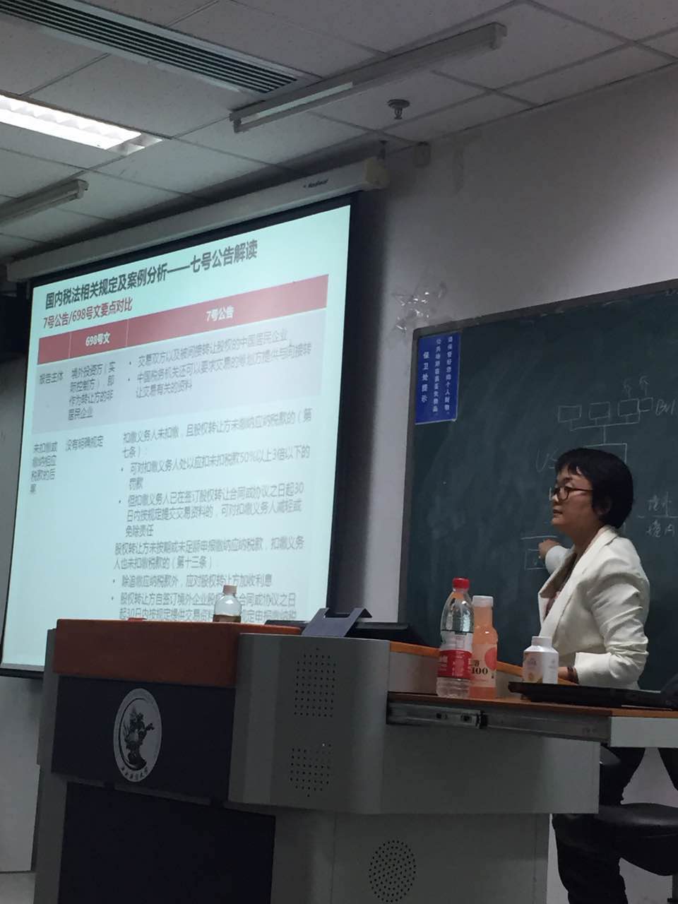 9月28日晚,在沙河校区6-106教室,太阳成集团tyc33455cc官网17级税务专业硕士案例研讨课第3期(总第13期)如期开讲。此次的主讲人为京东集团税务总监张爱华老师。张老师通过法规解读、案例讲解为同学们介绍了非居民企业间接股权转让的相关知识。刘金科老师主持并参加了此次案例研讨课,杨虹教授、黄云教授也参加了这次课程,并同张老师开展了热烈的讨论。
