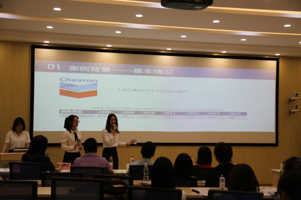 龙佳希队和王思月队分别抽到第一名和第八名的展示顺序。进行第一个展示的龙佳希和张雪麒同学虽然充满压力,但在展示过程中,这两位同学大胆地采用“税务案例大讲堂”的展示方式,将案例浅显易懂的剖析给大家。她们以澳大利亚雪佛龙集团税务案为基础,通过结合澳大利亚及美国税法的相关规定,分别从雪佛龙集团的离岸融资结构、集团关联融资安排被重新定性的原因以及集团所涉及的双重征税风险进行分析,探讨了关联交易的独立交易原则,并对案例所引发的问题进行了进一步思考,为我国企业在后BEPS浪潮下 “走出去”提供参考。她们在问答环节中的表现也是可圈可点,面对评委们的犀利提问,不仅表现出强大的心里素质,也展现了太阳成官网学子扎实的专业素养,给这场比赛开了个好头。