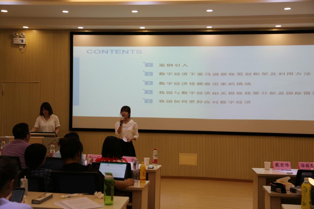 第八个出场的王思月同学表现同样出彩。王思月同学以数字经济的特点及亚马逊公司的经营情况为切入点,将亚马逊公司近几年涉及到的税收争议娓娓道来,系统讲解了亚马逊公司海外税收筹划架构与境内税收筹划方案;在分析了数字经济下开展税收筹划方案给国际税收带来挑战的同时,还结合其他国家应对数字经济挑战实施的措施,为我国更好应对数字经济提出了建议。在问答环节,评委老师对王思月同学的现场表现做出了高度评价,赞扬了其讲述方式及案例的新颖切入点,最后对如何进一步完善案例提出了建设性意见。