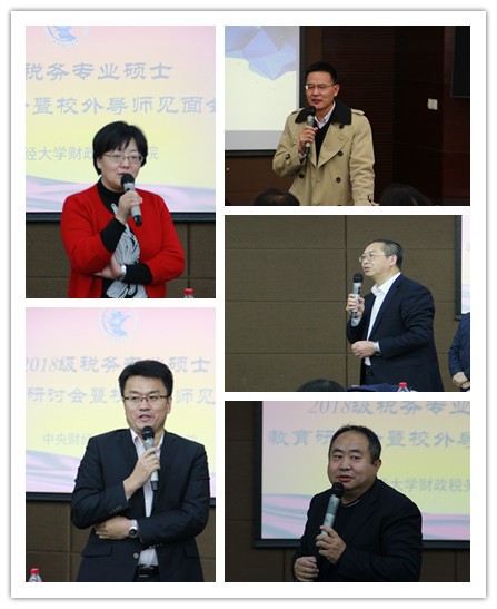 校外导师在会上纷纷发言,为中财税务专硕的培养献计献策。北京智方圆税务师事务所有限公司总裁王冬生先生,充分肯定了中财学子学术综合素质,并对同学们提出了几点建议,第一是提高写作能力,第二是提高哲学水平,要善于辩证思维。北京鑫税广通税务师事务所有限公司董事长王进先生指出,2019-2020年国家将要建立1000家税务师事务所与高校的校企实习基地,希望能继续与中财税务专业加强合作。德勤会计师事务所合伙人宫滨先生在会上对同学们提出几点希望,一是在学习过程中多去关注思路与方法,多去接触税务的方方面面。二是把握好两年的时间,积极参与学习、实践、实习等,一定要锻炼同时处理多个任务的能力,三是时刻注重对自己的管理,无论毕业后走向哪里,都要接受社会的考验。北京市国税局第二稽查局孔丹阳副局长也对同学们提出几点建议:一要注重课程学习;二要多学科融合学习,努力成为复合型人才。尤尼泰税务师事务所董事局主席刘志忠先生提出,税务行业用自己的智慧做出贡献,同学们毕业后进入这个行业将会在工作中不断提升自己的能力,获得更好地发展。普华永道会计师事务所合伙人钱江涛先生认为,不管以后从事什么行业,最重要的是对个人能力的培养,用自我驱动力去学习了解更多的东西。德勤会计师事务所税务经理李权周先生以自己在税务局工作的经历与同学们共勉,表示将继续为同学们的实习实践提供机会。德勤会计师事务所税务经理嵇峰先生用自己的亲身经历描绘了从事税务行业的苦与乐,建议同学们根据自己的兴趣在税务服务里选择最适合自己的领域。乾元中利国际税务咨询(北京)有限公司副总经理燕东先生认为,大家在学校除了学习工作外要思考的东西,多涉猎,多思考。华夏幸福基业股份有限公司财务部负责人许军先生从职业发展的角度跟同学们交流了上市公司和社会需要什么样的人才,希望同学们能学有所用。