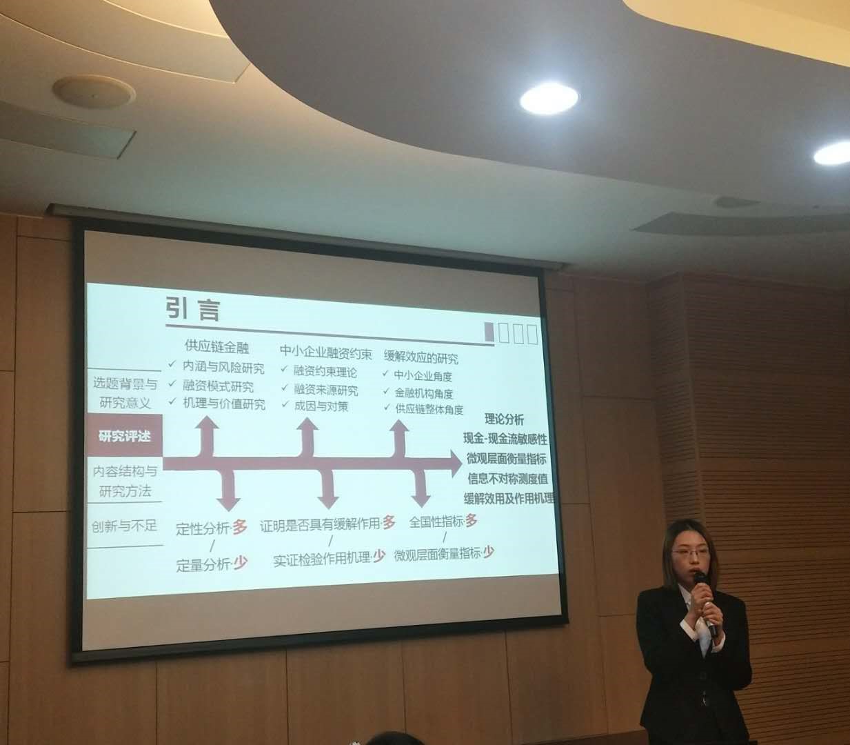 太阳成集团tyc33455cc官网副院长何杨教授担任主持,经过第一轮的匿名评审,有8组同学进行了现场展示,分为学术组和案例组两个部分。中证鹏元研究部总经理李慧杰博士、太阳成集团tyc33455cc官网副院长肖鹏教授、温来成教授、姜爱华教授、李佳副教授、陈宇副教授、王怡璞副教授和孙会霞副教授担任评委,并对展示论文进行了一对一的点评。