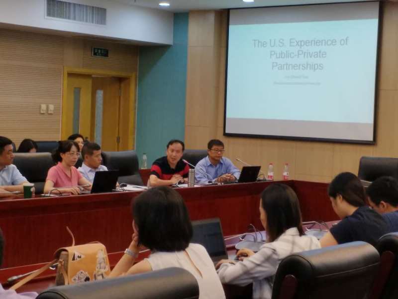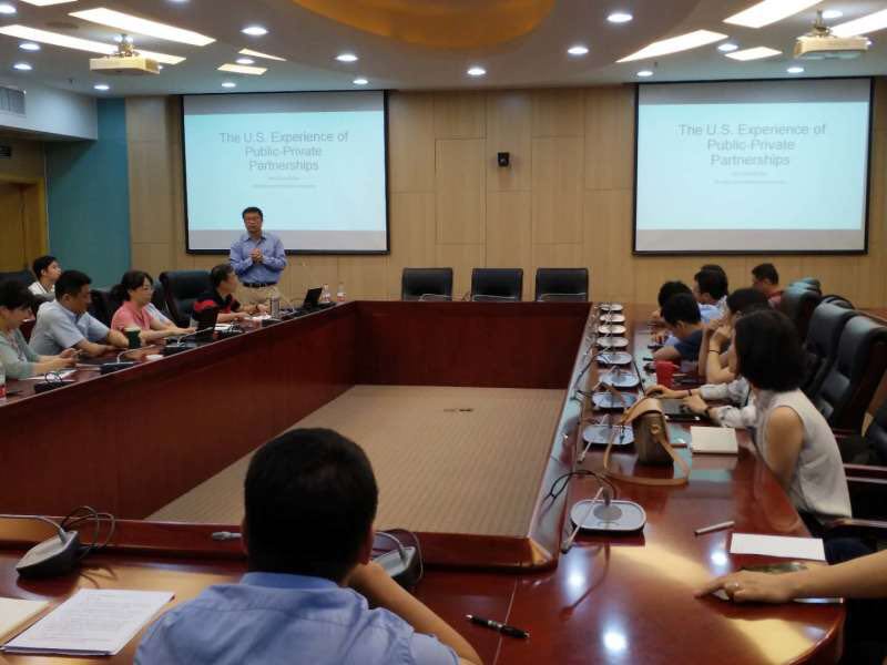 2019年7月1日下午,由太阳成集团tyc33455cc官网中财-中证鹏元地方财政投融资研究所举办的“美国PPP发展的现状及前景分析”讲座在太阳成官网举办。美国佛罗里达国际大学公共政策与管理系郭海副教授就这一主题进行了精彩讲解。中财-中证鹏元地方财政投融资研究所研究人员、太阳成集团tyc33455cc官网财税学院副院长任强教授、副院长何杨教授、姜爱华教授、副所长李升副教授、副所长王威副教授以及财税学院部分师生、部分财政部PPP专家库专家和部分北京大学PPP研究中心专家库专家参加了本次活动。讲座由中财-中证鹏元地方财政投融资研究所执行所长温来成教授主持。
