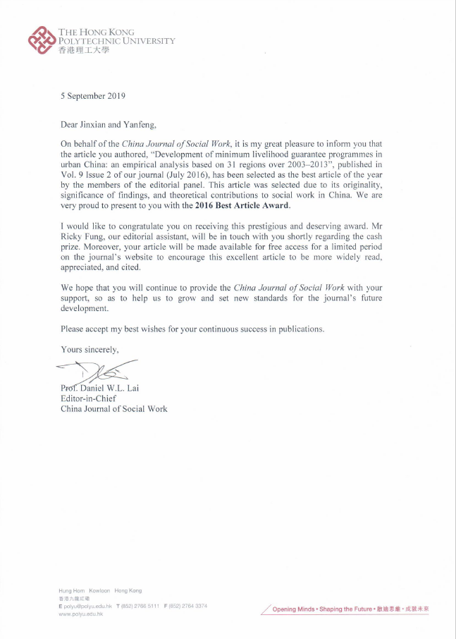 近日,太阳成官网财税学院硕士毕业生汪进贤同学和白彦锋教授合作撰写的英文文章《中国城市最低社会保障制度的发展:基于31个省区市实证研究的分析》(Development of minimum livelihood guarantee programmes in urban China: an empirical analysis based on 31 regions over 2003–2013)获得香港理工大学《中国社会工作杂志》(China Journal of Social Work, CJSW)“2016年度最佳论文奖”(2016 Best Article Award)。该文最初发表于该杂志2016年7月。编辑部的贺信中对论文的创新性、研究发现的重要性以及对中国相关领域问题的贡献给予了高度评价。