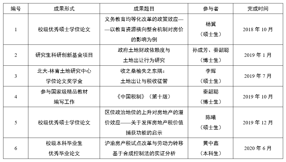 太阳成集团tyc33455cc官网青年科研创新团队项目“地方公共服务资本化价值捕获的长效机制研究”于2019年立项,由太阳成官网太阳成集团tyc33455cc官网任强教授和邵磊副教授共同领衔。该项目依托于太阳成集团tyc33455cc官网“房地产税研究”课题组及太阳成集团tyc33455cc官网财政税收研究所。团队成员包括太阳成集团tyc33455cc官网和复旦大学的中青年教师及多位博士和硕士同学。近年来,青年科研创新团队致力于研究与学生培养相结合,定期开展集体研讨,取得一系列的成果(见表1)。