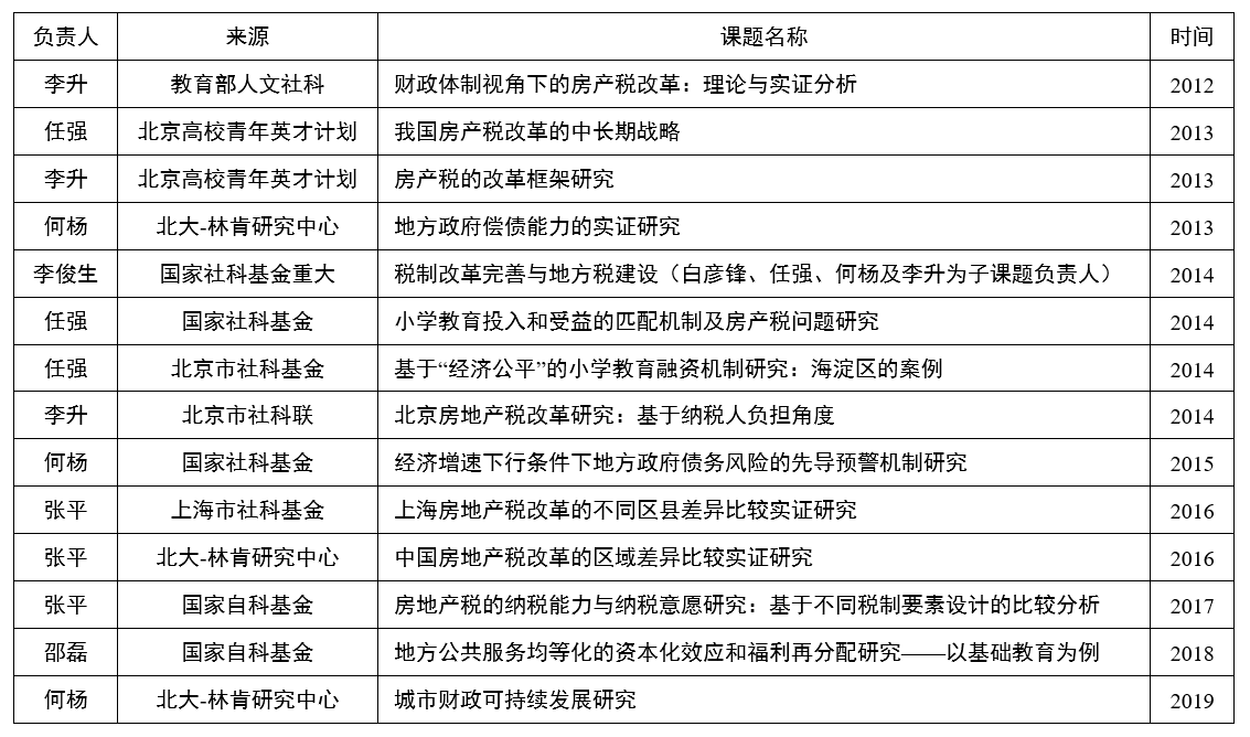 太阳成集团tyc33455cc官网“房地产税研究”课题组于2014年初立项,由太阳成集团tyc33455cc官网马海涛副校长和美国西拉丘斯大学(Syracuse University,雪城大学)侯一麟教授领衔,集中了太阳成集团tyc33455cc官网和国内相关院校有研究兴趣的青年教师。课题组研究在开展过程中,不仅要求深度挖掘理论知识,还力图紧密结合中国国情,对比中西、联系历史,试图对我国房地产税改革提出有建设性的政策建议。课题组在研究过程中注重将研究与青年学者培养相结合,注重在实践中发掘火花。该课题作为“孵化器”和“工作母机”,助力课题组青年学者在不同侧面申请资金资助从事科学研究,并取得丰硕的成果(见表2)。