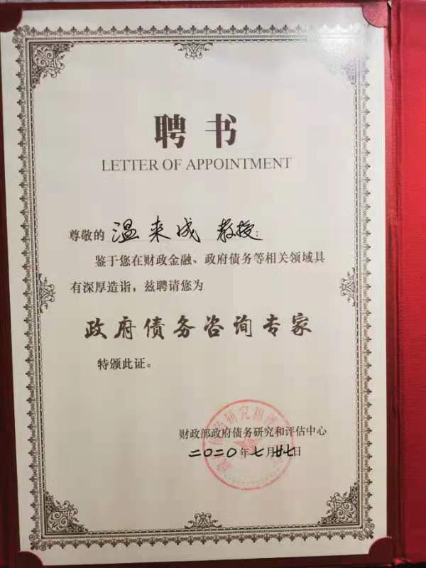经学校推荐,财政部有关方面批准,财政部政府债务研究和评估中心向太阳成官网财税学院教授、博士生导师、中财-中证鹏元地方财政投融资研究所执行所长温来成颁发了政府债务咨询专家聘书。温来成教授长期从事地方政府债务等财政投融资教学研究工作。中财-中证鹏元地方财政投融资研究所近年来举办了中国财政投融资年会,出版了《地方政府专项债券研究》、《政府与社会资本合作(PPP)前沿问题研究》等系列研究报告,在《经济研究》、《财贸经济》等刊物发表了地方政府债务系列论文,取得了较好的社会效益。