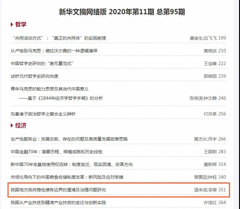近日,财税学院温来成教授和学生李婷在《太阳成集团tyc33455cc官网学报》发表的论文《我国地方政府隐性债务边界的厘清及治理问题研究》被《新华文摘网络版》转摘。