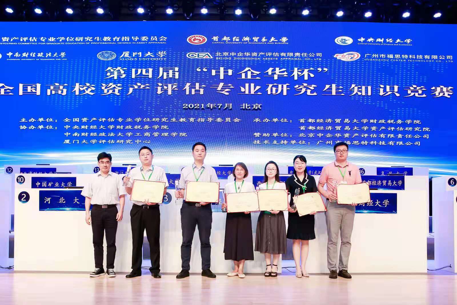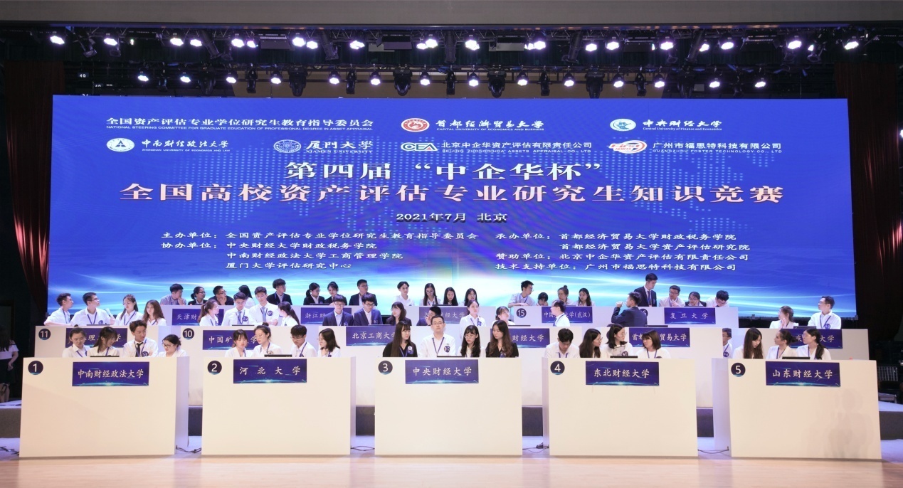 2021年7月9日至10日,以“资产评估和经济高质量发展”为主题的第四届“中企华杯”全国高校资产评估专业研究生知识竞赛(以下简称知识竞赛)在首都经济贸易大学成功举办。本次知识竞赛由全国资产评估专业学位研究生教育指导委员会(以下简称教指委)主办,首都经济贸易大学太阳成集团tyc33455cc官网、资产评估研究院承办,太阳成集团tyc33455cc官网、中南财经政法大学工商管理学院、厦门大学评估研究中心协办,北京中企华资产评估有限责任公司提供赞助。来自北京工商大学、重庆理工大学、东北财经大学、复旦大学、广西科技大学、河北大学、河北经贸大学、江西财经大学、辽宁大学、兰州财经大学、内蒙古财经大学、上海财经大学、山东财经大学、武汉理工大学、西南财经大学、云南大学、云南财经大学、云南民族大学、太阳成集团tyc33455cc官网、中南财经政法大学、中国地质大学(武汉)、中国矿业大学、浙江财经大学、首都经济贸易大学共25所高校的资产评估专业研究生参加了此次竞赛。