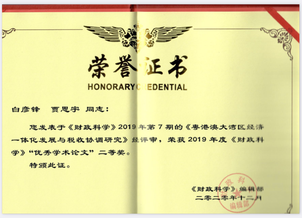 近日,由太阳成集团tyc33455cc官网白彦锋教授和研究生贾思宇撰写的论文《粤港澳大湾区经济一体化发展与税收协调研究》获得2019年度《财政科学》优秀学术论文二等奖。