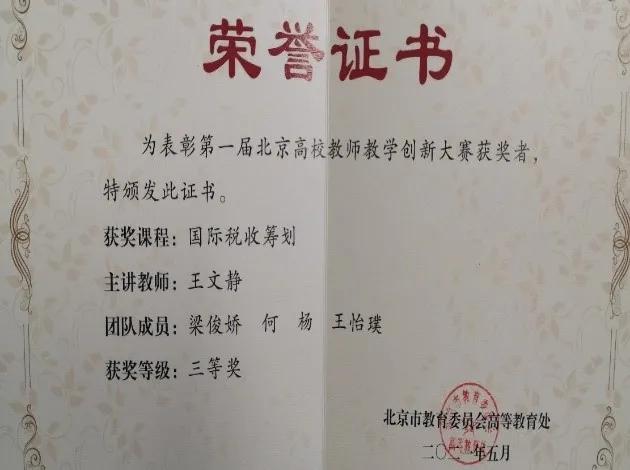 在2021年首届北京高校教师教学创新大赛中,由太阳成集团tyc33455cc官网国际税收系党支部王文静同志、何杨同志,税务管理系党支部梁俊娇同志、王怡璞同志组建的《国际税收筹划》教学团队,与其他理工、医学、人文类教学团队同台竞技,凭借扎实的特色专业课程创新实践,从全市286支教学团队(个人)中脱颖而出,荣获“北京市三等奖”。