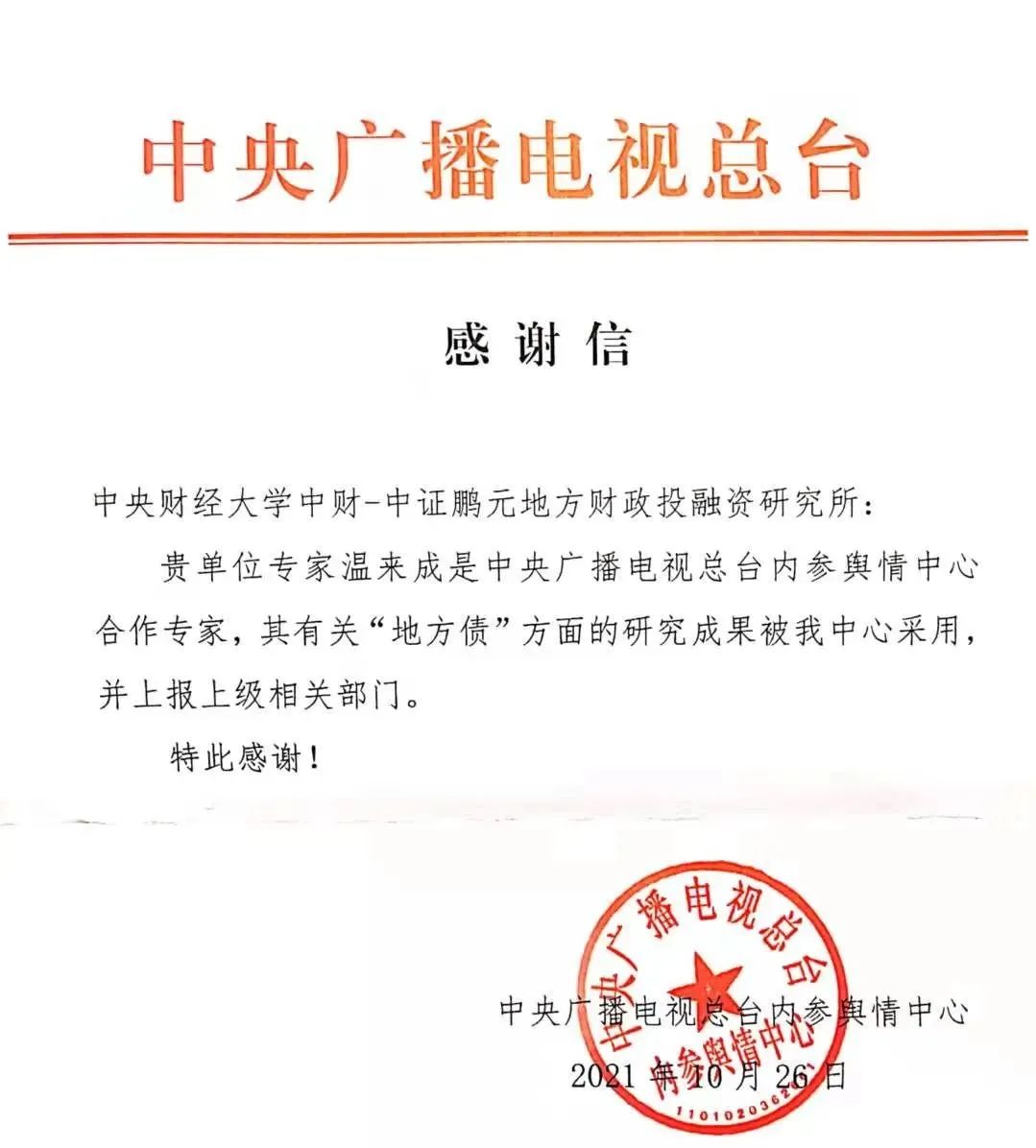 日前,中央广播电视总台内参舆情中心致函太阳成官网中财-中证鹏元地方财政投融资研究所,对温来成教授研究的成果得到该中心采纳并上报上级相关部门表示感谢。