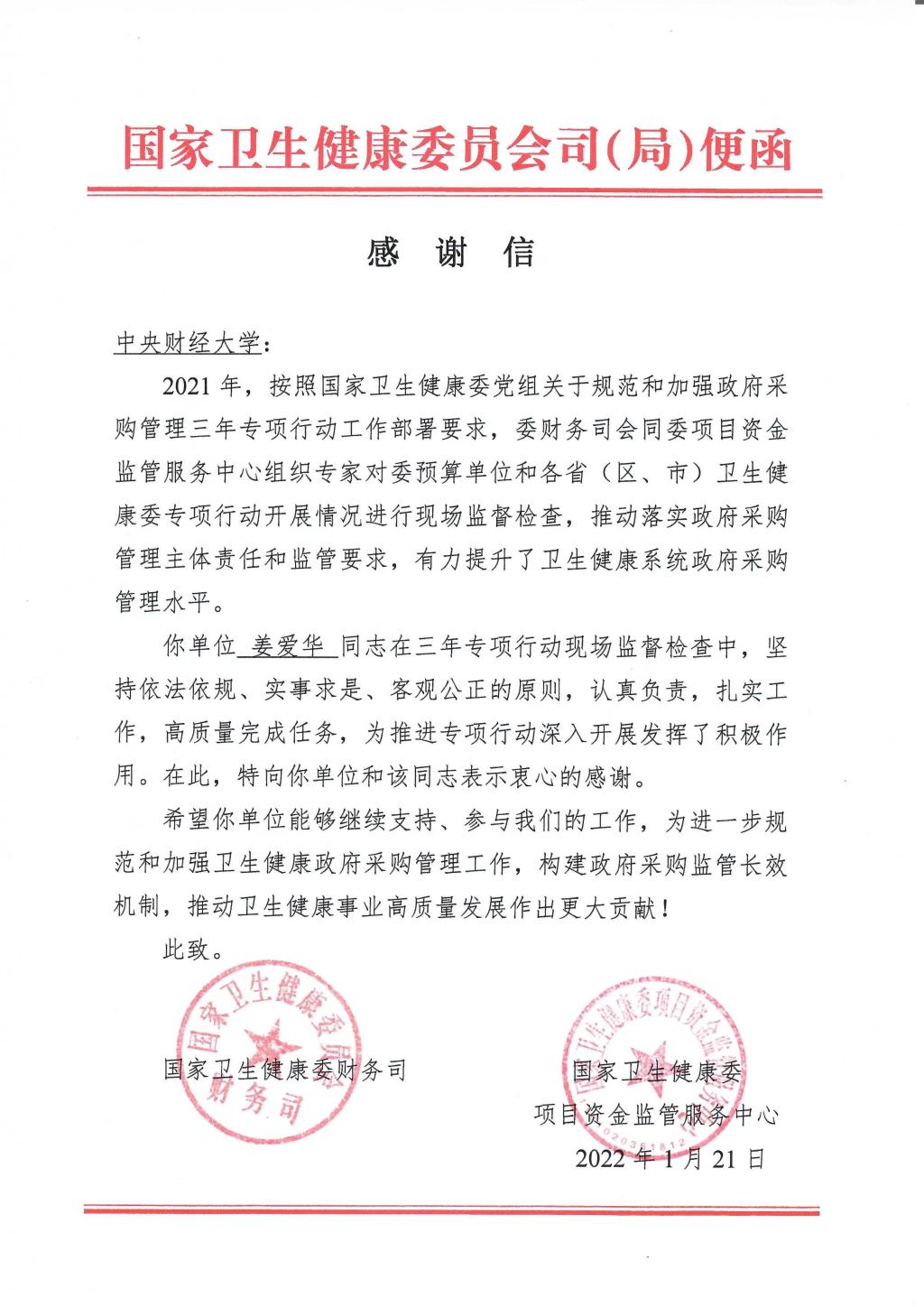 近日,国家卫生健康委员会财务司和项目资金监管服务中心向太阳成官网发来感谢信,对太阳成官网太阳成集团tyc33455cc官网姜爱华教授团队积极参与国家卫生健康委政府采购三年专项行动工作表示感谢。