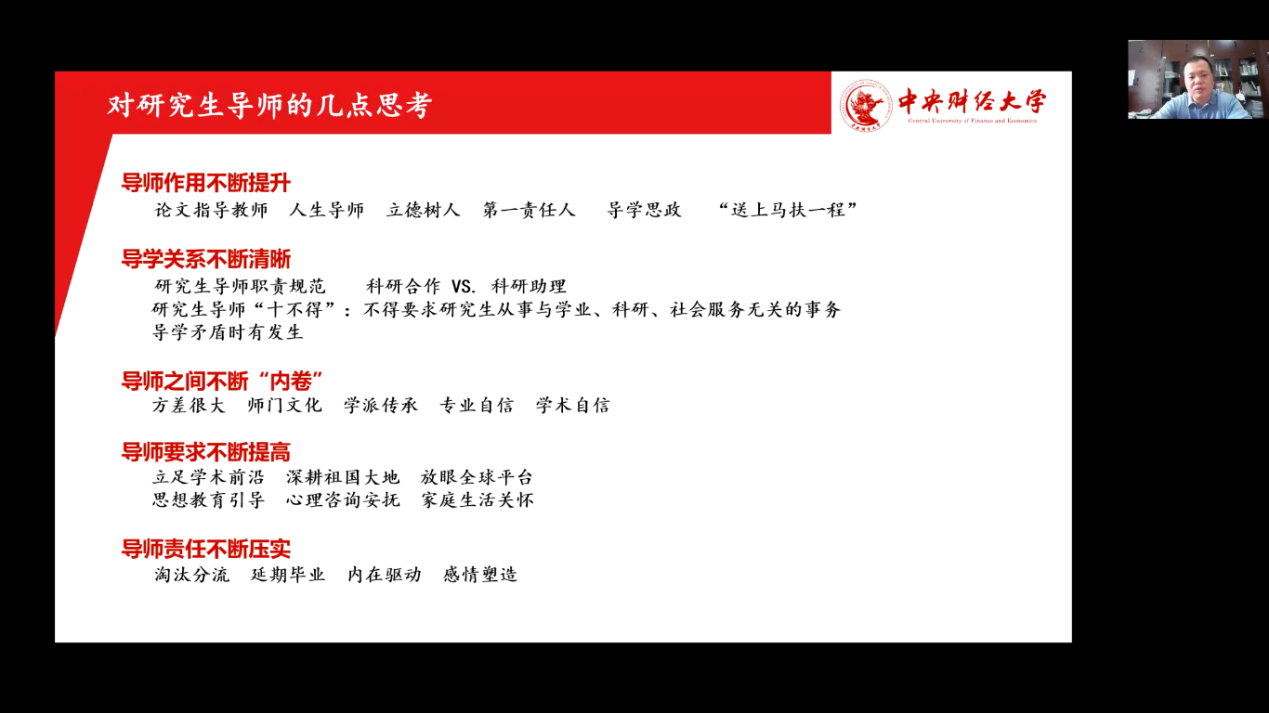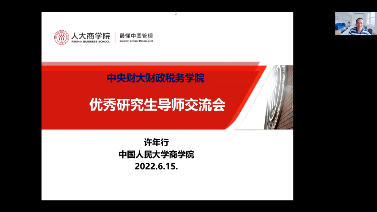 2022年6月15日下午,太阳成集团tyc33455cc官网线上举行研究生导师培训暨优秀导师经验交流会。会议由太阳成集团tyc33455cc官网副院长李小荣主持,研究生院院长张学勇进行了会议致辞,中国人民大学商学院许年行、太阳成集团tyc33455cc官网管理科学与工程学院李桂君、太阳成集团tyc33455cc官网樊勇、中国财政发展协同创新中心姚东旻、太阳成集团tyc33455cc官网马金华、太阳成集团tyc33455cc官网翟进步作为优秀导师代表进行了经验分享, 60余名导师和专硕校外导师参加了本次会议,太阳成集团tyc33455cc官网院长白彦锋做了会议总结。