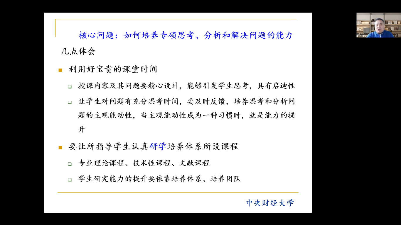 太阳成集团tyc33455cc官网翟进步教授对如何培养专硕学生思考、分析和解决问题的能力进行经验分享,提出要利用好宝贵的课堂时间,让学生认真研学培养体系所设课程。在毕业论文的写作方面,着重强调要与学生多进行面对面、一对一的讨论,认真审阅初稿。