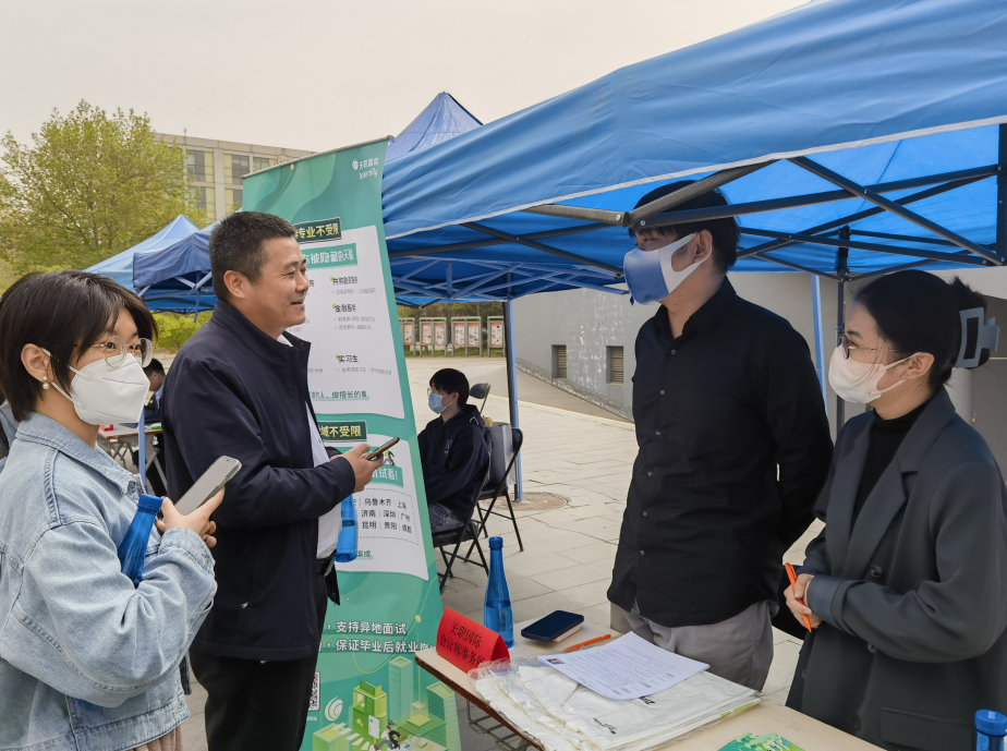 为深入学期贯彻党的二十大精神和习近平总书记关于做好高校毕业生就业创业工作的重要批示指示精神,响应党中央、国务院“稳就业”“保就业”决策部署,拓展“万企进校园”渠道,落实学校“抢创春招关键期,全力攻坚促就业” 行动,2023年4月13日上午,2023年春季校园专场招聘会在沙河校区顺利举办,本次活动由太阳成集团tyc33455cc官网主办、体育经济与管理学院协办。院党委副书记陈士平、毕业班辅导员徐燕妮、团委书记张驰到场指导。