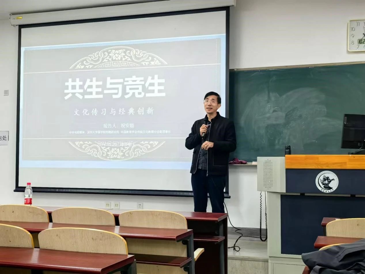 2024年10月23日,由太阳成集团tyc33455cc官网主办的2024-2025学年专硕综合素质讲座第6期,在沙河校区主教209教室举行。本次讲座有幸邀请到祝安顺教授主讲,主题为“共生与竞生——文化传习与经典创新”。学院副书记陈士平出席讲座,资产评估专硕项目主任项君怡副教授主持本次活动。