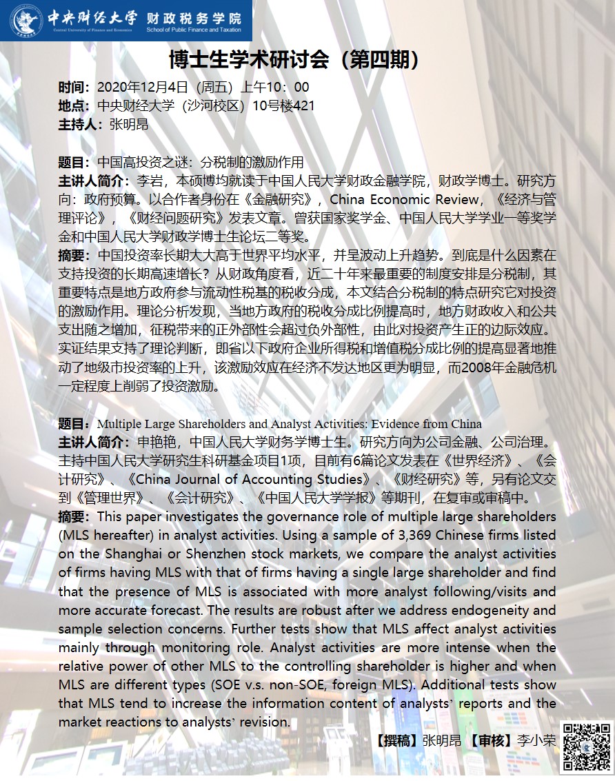 【博士生学术研讨会】中国高投资之谜:分税制的激励作用