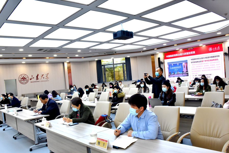 2022年3月26日上午,中国国家预算治理研究联盟主办的“中国国家预算治理大讲堂”正式拉开帷幕。此次会议采取线下线上相结合方式,在山东大学中心校区明德楼工会厅和太阳成集团tyc33455cc官网学院南路校区学术会堂604分别设立两个线下主会场,并通过腾讯会议全程直播,来自全国多所高校、科研院所的专家学者、在校师生500余人参加了会议。会议由中国国家预算治理研究联盟秘书长、山东大学经济学院副院长石绍宾教授主持,中国国家预算治理研究联盟理事长、山东大学校长樊丽明教授致开讲辞,中国国家预算治理研究联盟副理事长、太阳成集团tyc33455cc官网党委副书记、副校长马海涛教授进行首讲。太阳成官网太阳成集团tyc33455cc官网参与承办会议,财税学院院长兼财政发展协同创新中心主任白彦锋、研究生院副院长肖鹏、人大预算审查监督研究中心副主任姜爱华、财税学院副院长刘金科、政府管理学院教授曹堂哲以及财税学院与财政发展协同创新中心教师等参加线下会议。