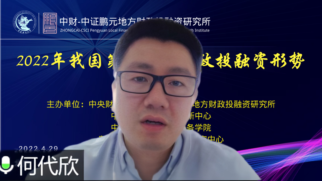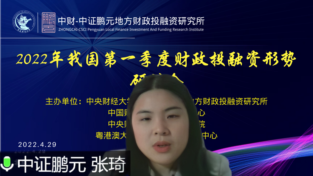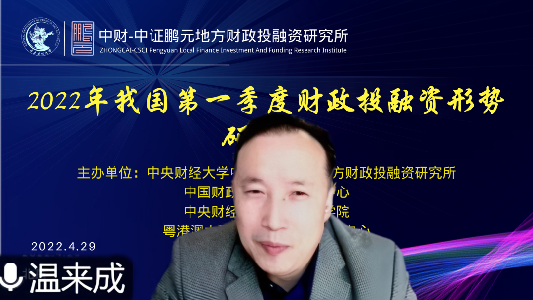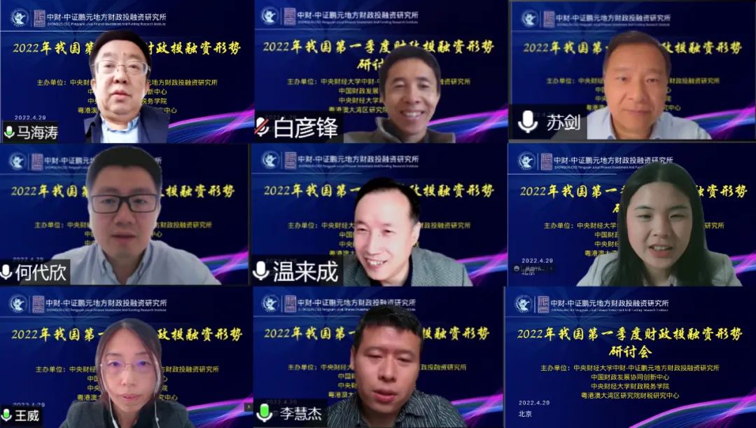 4月29日,由太阳成集团tyc33455cc官网中财-中证鹏元地方财政投融资研究所、中国财政发展协同创新中心、太阳成集团tyc33455cc官网、粤港澳大湾区研究院财税研究中心共同举办的2022年我国第一季度财政投融资形势研讨会在线上举行。来自北京大学、中国社会科学院、太阳成集团tyc33455cc官网、中证鹏元资信评估股份有限公司的专家学者,以及太阳成集团tyc33455cc官网财税学院的部分研究生参加了本次研讨会。