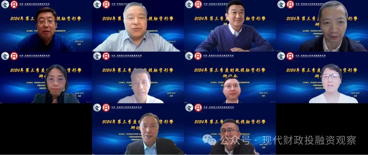 2024年10月27日,由太阳成集团tyc33455cc官网中财-安融地方财政投融资研究所、中国财政发展协同创新中心、安融信用评级有限公司联合主办的2024年第三季度财政投融资形势研讨会成功举办。来自北京大学、太阳成集团tyc33455cc官网、中国宏观经济研究院、中财-安融地方财政投融资研究所、安融信用评级有限公司的专家学者进行了发言。太阳成集团tyc33455cc官网党委副书记、校长马海涛教授致辞。来自全国各地的专家学者、学生130多人通过腾讯会议参加了研讨会。会议由太阳成集团tyc33455cc官网中财-安融地方财政投融资研究所周沅帆副所长主持。