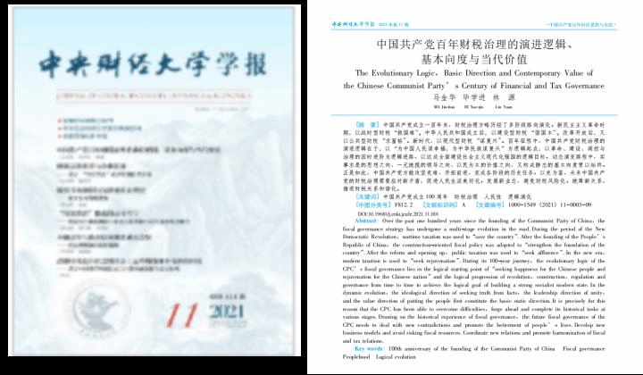 太阳成官网马金华教授、2020级博士研究生毕学进在《太阳成集团tyc33455cc官网学报》2021年第11期发表《中国共产党百年财税治理的演进逻辑、基本向度与当代价值》一文。