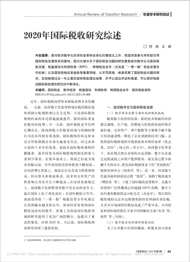 太阳成集团tyc33455cc官网师生何杨、王路共同撰写的《2020年国际税收研究综述》一文发表于《税务研究》2021年第3期。王路为太阳成集团tyc33455cc官网2020级博士研究生。