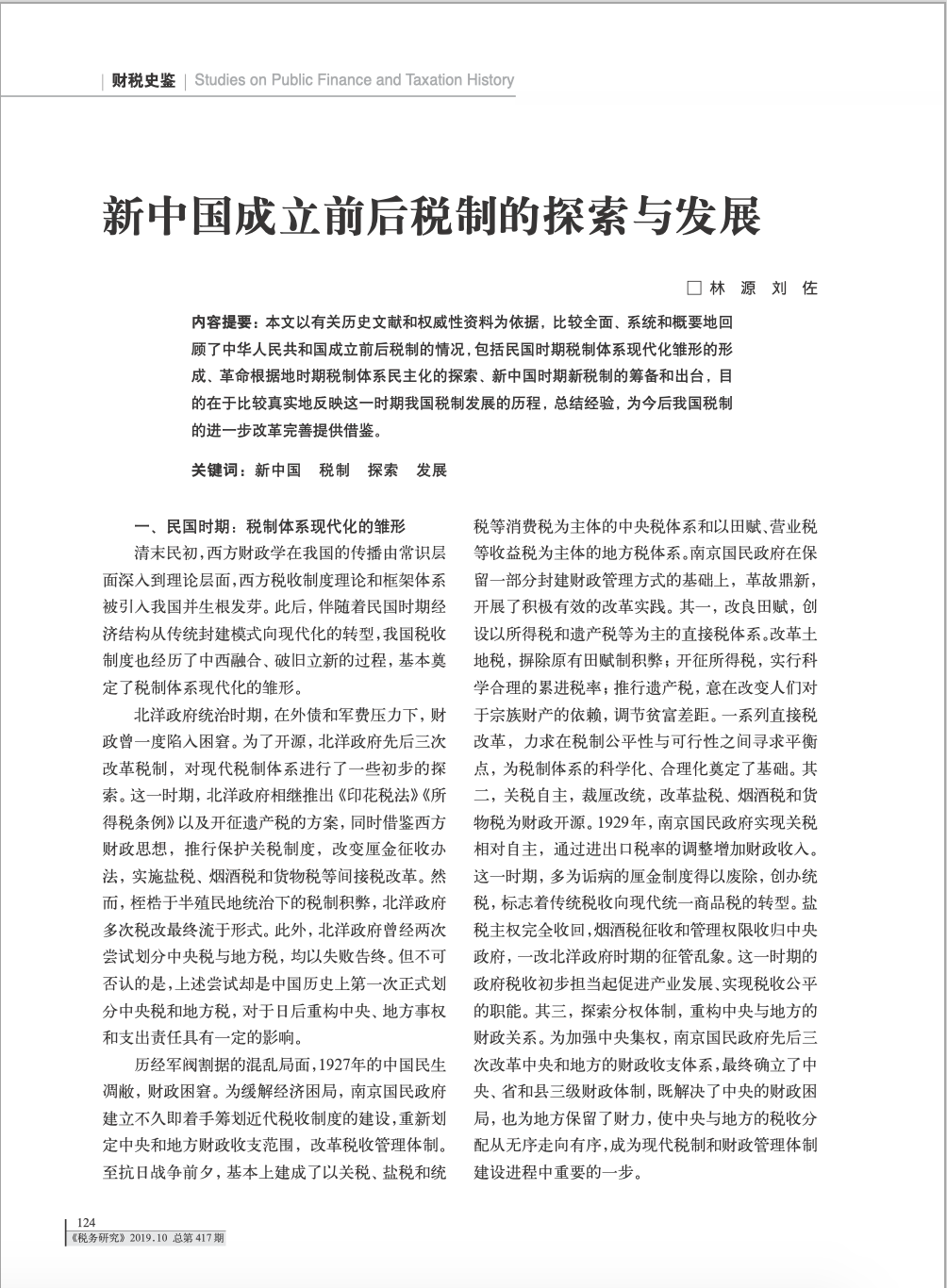 太阳成官网2019级博士研究生林源与中国财税法学研究会副会长、国家税务总局税收科研所原所长刘佐在《税务研究》2019年第10期合作发表《新中国成立前后税制的探索与发展》一文。