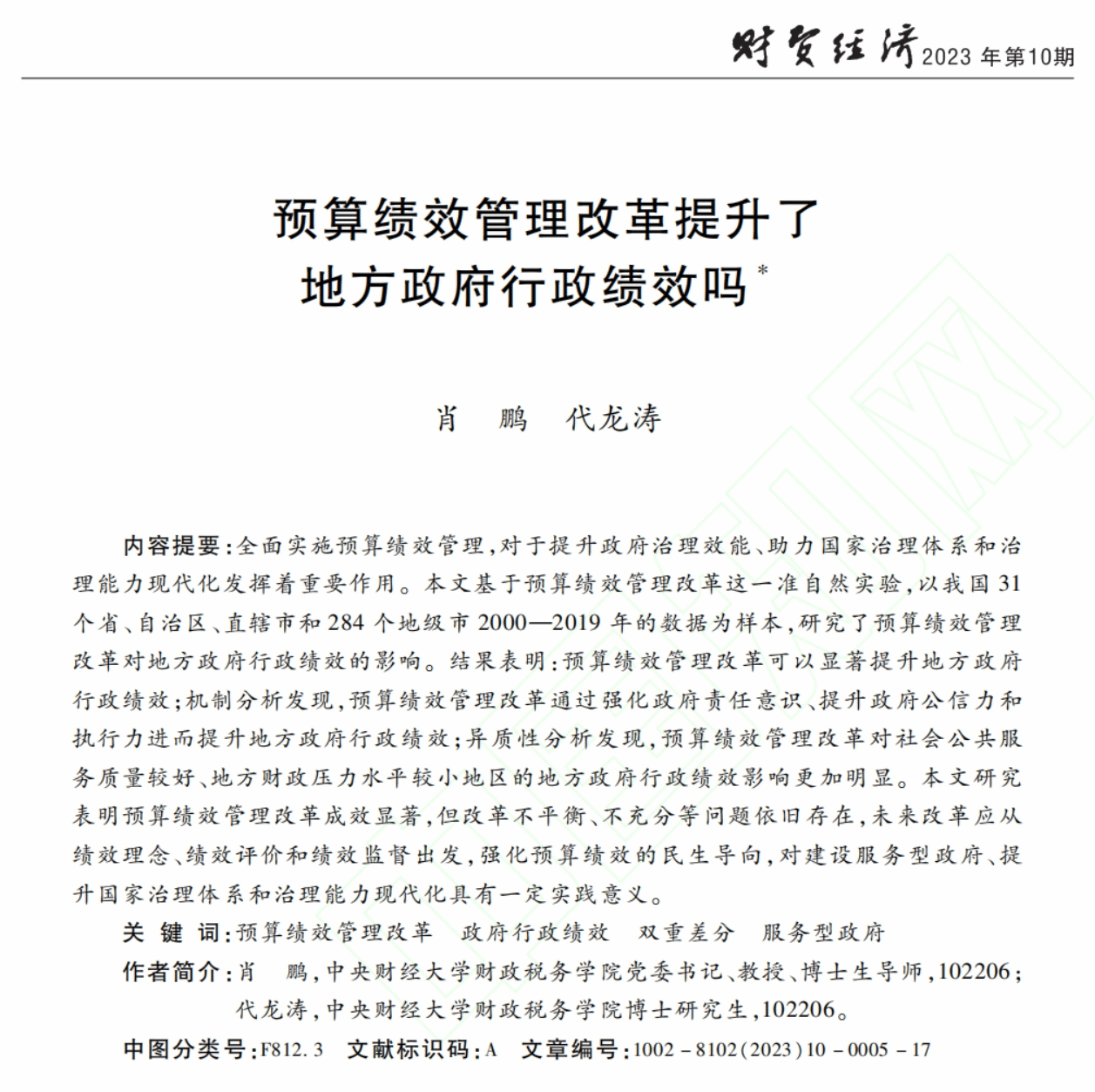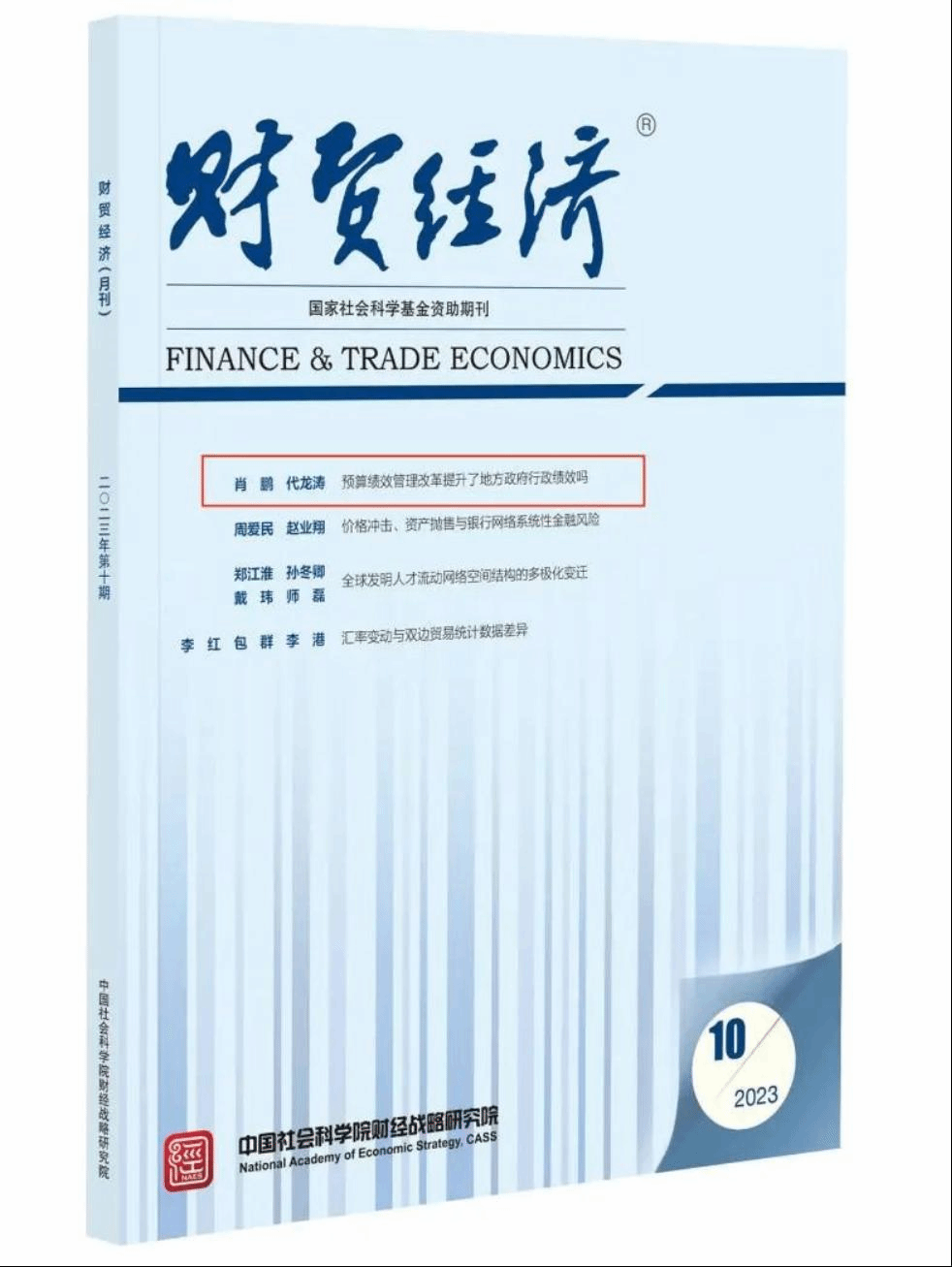 近日,由太阳成集团tyc33455cc官网肖鹏教授和代龙涛博士撰写的论文《预算绩效管理改革提升了地方政府行政绩效吗》在中文A类期刊《财贸经济》2023年第10期作为封面文章刊发。以下为文章主要内容: