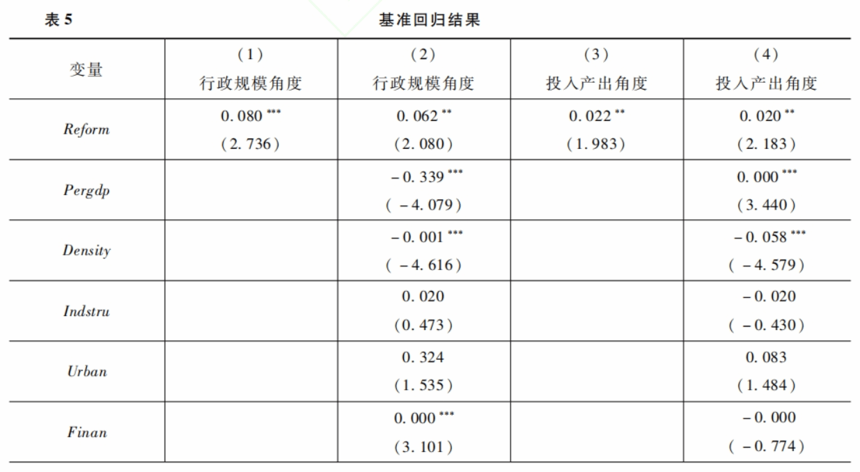 表5报告了基准回归结果,第(1)、(2)列结果表明,预算绩效管理改革显著地提升了地方政府行政绩效。第(3)、(4)列结果表明,从政府部门公职人员服务质量角度观察,预算绩效管理改革同样对于提升地方政府行政绩效发挥着显著作用。