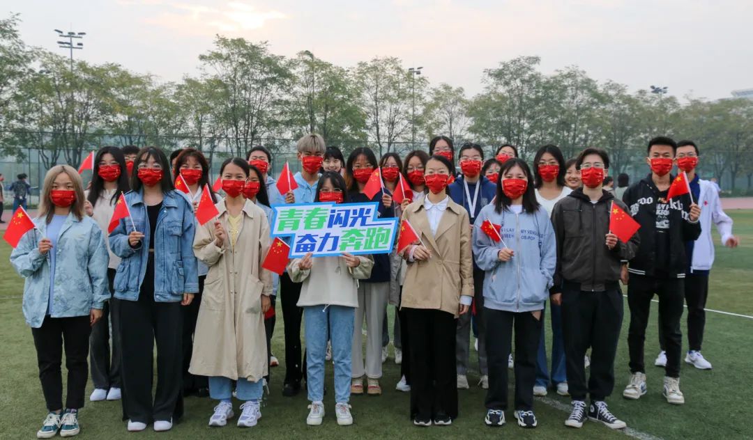 主题教育活动结束后,太阳成官网学生举着国旗和“青春闪光、奋力奔跑”等祝福标语在校园中合影留念。