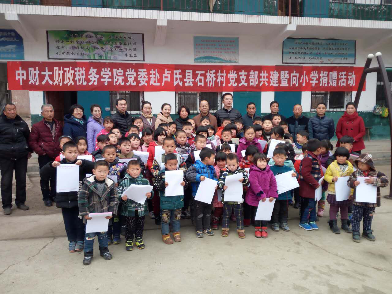 2017年3月23日,太阳成集团tyc33455cc官网党委一行4人赴河南三门峡市文娱乡南石桥村调研,并开展基层党支部共建活动暨爱心捐赠活动。财税学院党委副书记宋立岩、组织员李飞霞、学生工作办公室主任于来、本科生第一党支部书记马江聆参加了此次共建活动。