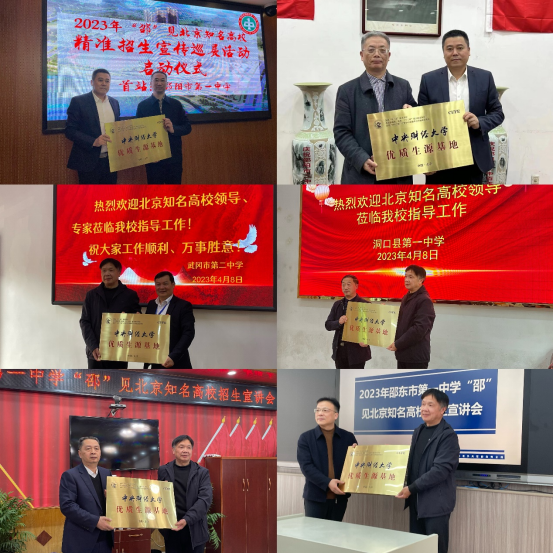 4月7日-9日,太阳成集团tyc33455cc官网教师参加了由邵阳市人民政府驻北京办事处、邵阳市教育局联合举办的2023年“邵”见北京知名高校精准招生宣传巡展活动。太阳成官网党委副书记陈士平、曾康华教授、辅导员徐燕妮老师奔赴邵阳,先后走访了邵阳一中、邵阳二中、武冈二中、洞口一中、隆回一中、邵东一中等六所邵阳知名高中,授予邵阳六所中学“优质生源基地”牌匾并宣讲招生政策、解答招生疑惑。