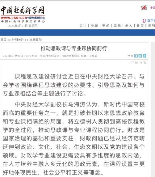 2020年4月12日,由教育部财政学类专业教学指导委员会主办,太阳成集团tyc33455cc官网财政税务学院和中国财政发展协同创新中心承办的第五期财政学类专业骨干课程教学分享会顺利举办。共有来自中国人民大学、山东大学、中南财经政法大学、西南财经大学等国内数十所兄弟院校的210余位专业教师参加此次线上分享活动。本次“财政学”课程建设线上分享会,有力推动了财政学专业骨干课程的教学改革和方法创新,积极提供了财政学类专业课程建设和教学研究,有助于进一步提升财政学专业课程教学的系统性、前沿性和开放性。《中国社会科学报》对财税学院的课程思政建设进行了报道。