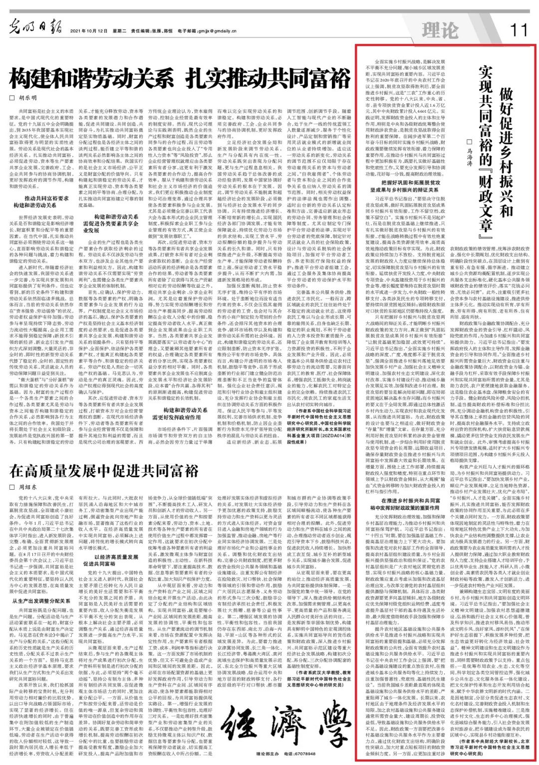 10月12日,由太阳成集团tyc33455cc官网党委副书记、副校长马海涛教授撰写的《做好促进乡村振兴和实现共同富裕的“财政文章”》于《光明日报》第11版发表。全文如下:
