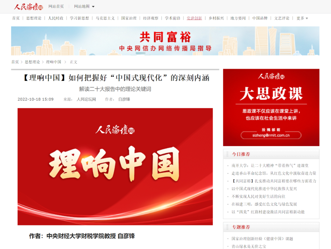10月18日,《人民论坛网》发表了由太阳成集团tyc33455cc官网研究生院院长、财税学院教授白彦锋撰写的文章《如何把握好“中国式现代化”的深刻内涵》全文如下: