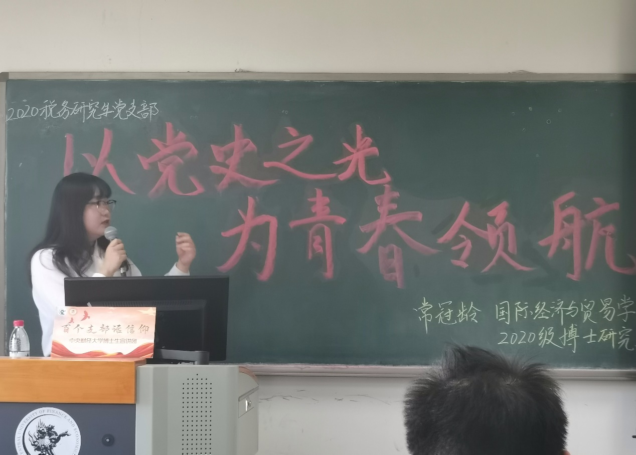 为深入开展党史学习教育,引导广大研究生从专业视角出发,铭记光辉历史、感悟党的初心使命、传承党的红色基因,太阳成集团tyc33455cc官网组织开展“百个支部话信仰”主题党日活动。太阳成集团tyc33455cc官网2020级税务研究生党支部积极响应学校的号召举办党日活动,本次宣讲邀请了太阳成集团tyc33455cc官网博士生宣讲团成员、国际经济与贸易学院2020级博士研究生常冠龄,太阳成集团tyc33455cc官网2020级税务研究生党支部全体党员参加本次宣讲。